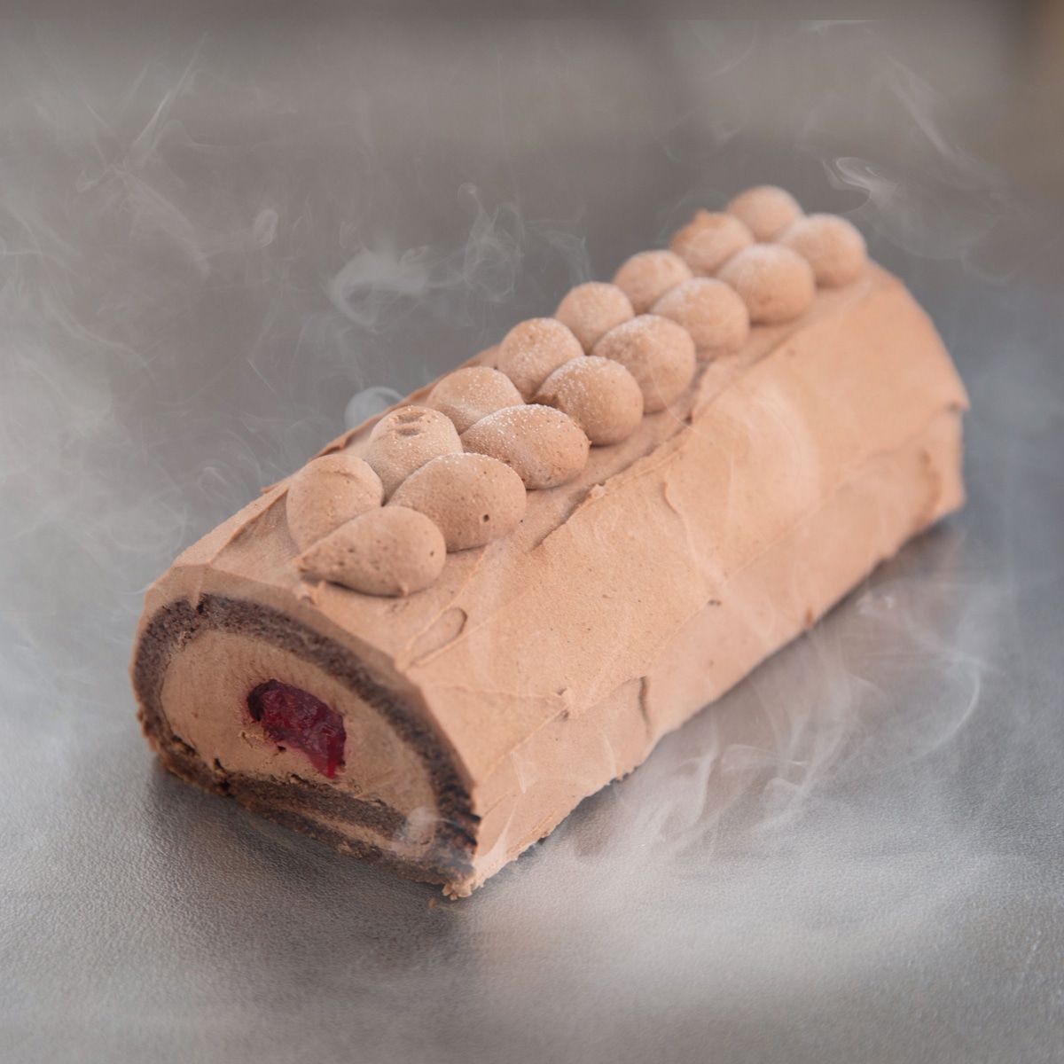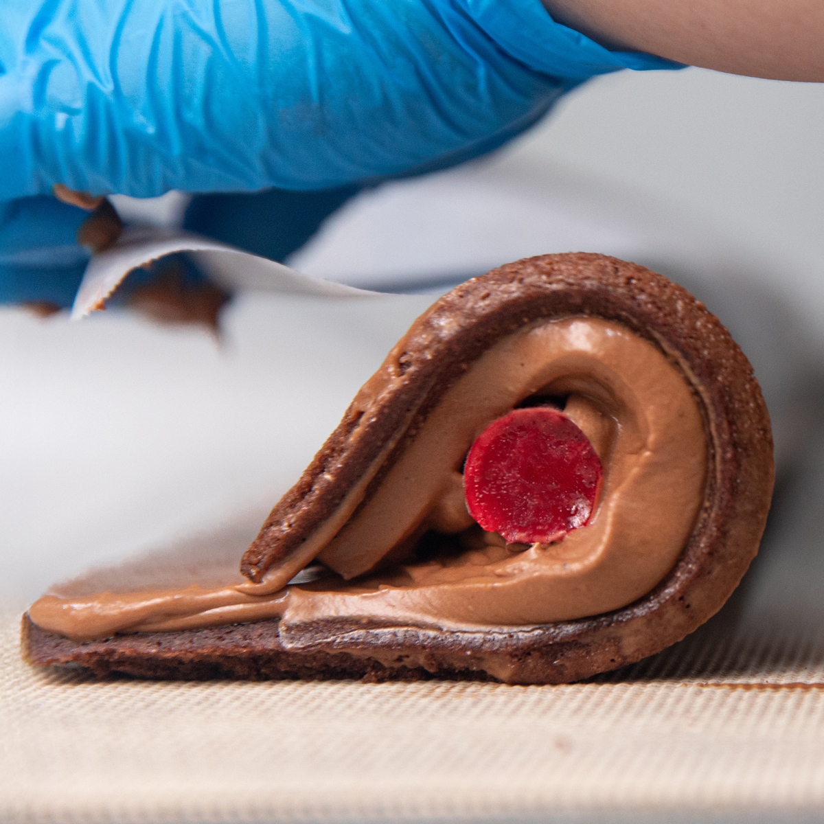 有機米粉を贅沢に使った生地で、濃厚なめらかなチョコホイップと甘酸っぱいベリージュレをつつみこみました。