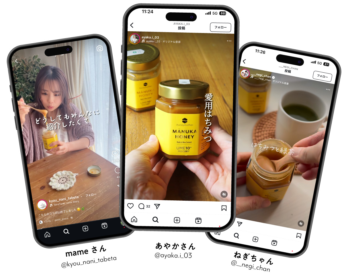 ハニーマザーは、多くの人気インフルエンサーからご支持をいただき、これまで様々なコラボレーションを行ってきました。インフルエンサーの発信力を通じて、マヌカハニーの魅力をより多くの方に伝え、皆さまの健やかな毎日をサポートしていきたいと考えています。
